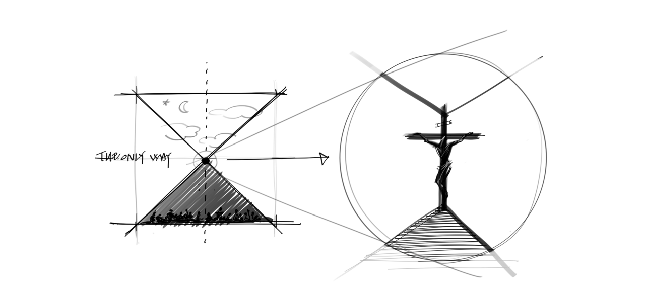 Aber es gibt einen Weg, den Gott aus Liebe zu uns orbereitet hat, dass wir zu ihm zurückkehren können. Dort wo sich die beiden Dreicke kreuzen, steht Jesus Christus.